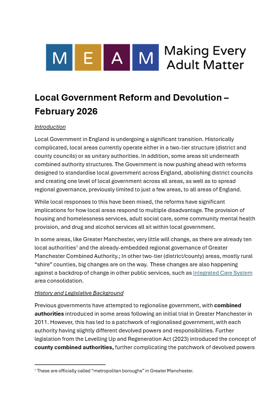 Making Every Adult Matter (MEAM) is the national charity supporting practitioners, policymakers and people with lived experience to transform services and systems for people facing multiple disadvantage.