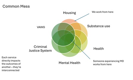 We understand that there are indicators of a healthy system that is best prepared to support individuals experiencing multiple disadvantage; one of which is joint understanding of the common mess (and making ‘common’ sense of this a priority). If we consider where people experiencing multiple disadvantage exist in our service eco-system, i.e., in the “centre” of these overlapping challenges, we are forced to conclude that a common purpose from that very same centre is required.